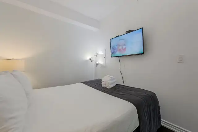 Advertised rate of $4,999/month (CAD) applies to the 2 Bedroom / 1 Bathroom suite only, based on single or double occupancy, with a move-in date on or before March 26, 2026, and a minimum prepaid stay of 92 consecutive nights. A minimum stay of 28 or more consecutive nights is required for all bookings. Rates for later move-in dates, higher occupancy (3–6 guests), and/or month-to-month stays are higher — contact us for a custom quote. All utilities (hydro, heat, A/C, water) are included free of charge. High-speed internet is included free of charge. A one-time final suite cleaning fee applies and is not included in the monthly rate. Pet-friendly suites available — pet fee and damage deposit apply. Smoking is not permitted inside the suite; smoking is permitted on the balcony only. All rates are in Canadian dollars and are subject to availability. Rates and terms are subject to change without notice.