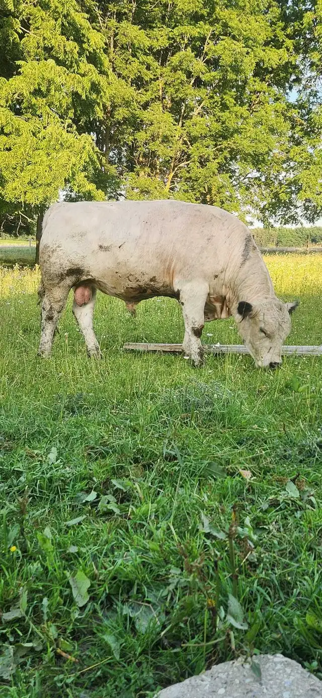 British White polled Bull for sale Roughly 2 year old he's not the petting Kind, but Gentle and easy to work around,