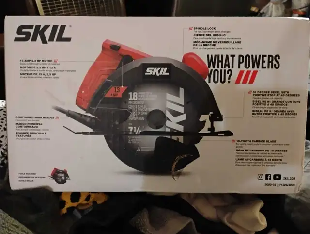 I'm selling a new Skil 13 Amp 7 1/4 inch circular saw, designed for easily cutting through a variety of materials with its powerful 2.3 HP motor. It features a spindle lock for fast blade changes, a 51-degree bevel with a positive stop at 45 degrees for greater cut capacity, and an 18-tooth carbide blade for quick, quality cuts in common lumber and sheet goods.