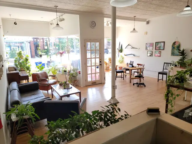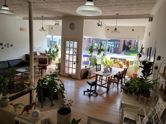 Our bright, open concept collective is on Dupont, with a bus stop right out front. Located in a great neighbourhood, steps away from parks, cool cafes and places to eat. It enjoys great natural light through the large storefront windows, and has 10ft high tin ceilings.