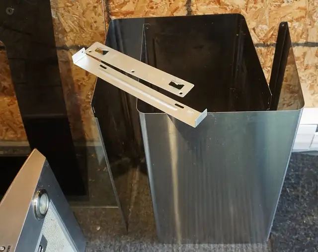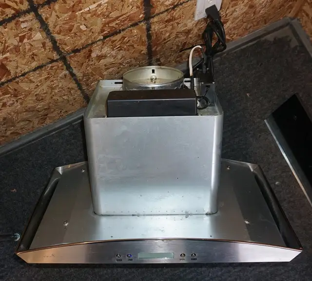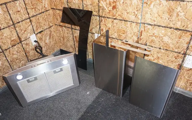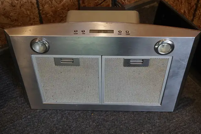 Description: Range hood. 30 in. wide. Made of metal and glass. Stainless steel finish. European design chimney hood. 450 CFM airflow. Two 4W LED bulbs included. Dishwasher safe aluminum filters feature a quick-release latch and professional style appearance. Push-button control. 3 speeds.