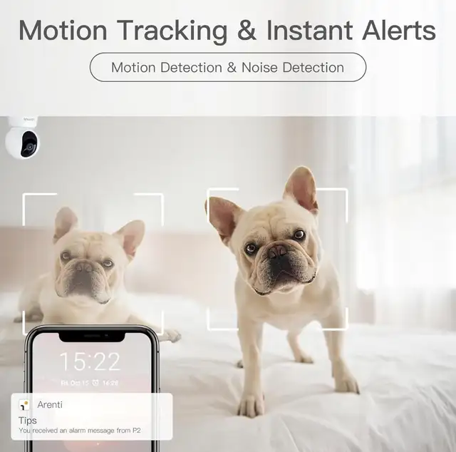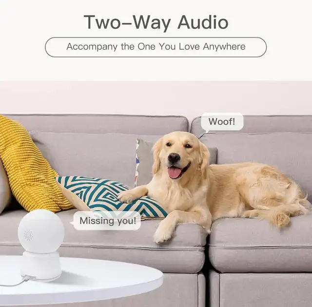 Equipped with smart motion and noise detection, the camera automatically tracks movement and alerts you in real time. The built-in two-way audio lets you talk to your pets or family members directly through the app.
