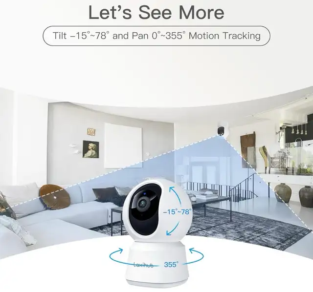 The LAXIHUB P2T Smart Camera delivers full 360° coverage with smooth pan and tilt control, ensuring no corner of your room goes unseen. Its 2K/3MP HD resolution provides sharp, detailed video so you can monitor pets, family, or your home with confidence.