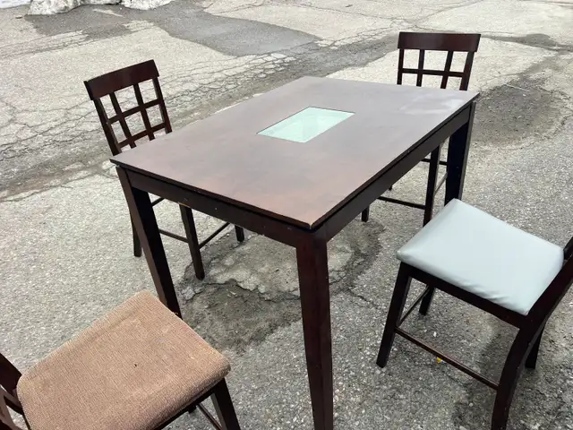 This used dark wood dining table set comes with four chairs. The table has a decorative green glass inlay in the centre. It's a great option for smaller dining spaces or kitchens. Perfect for casual meals or intimate gatherings!