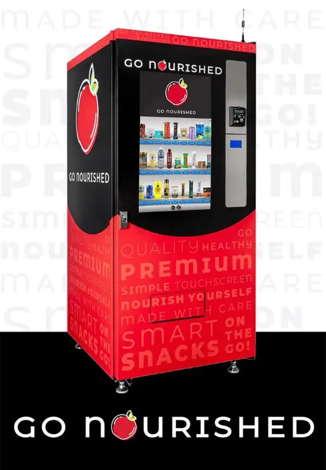 2 Go Nourished Smart Combo Vending Machine. 27" LCD interactive touch screen display. Refrigerated Drink Selection.