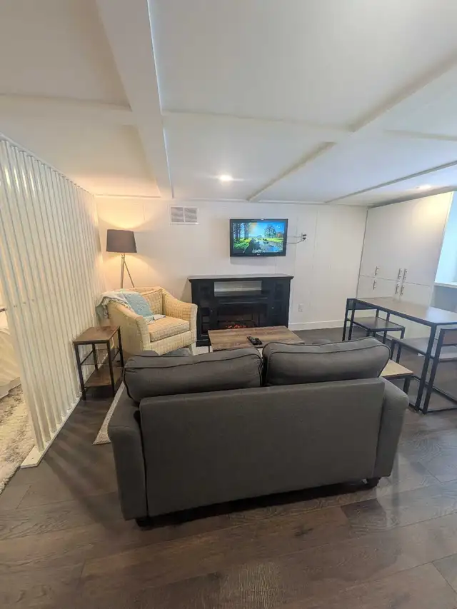 - Fully furnished living/dining area with TV and electric fireplace for a warm, relaxing atmosphere