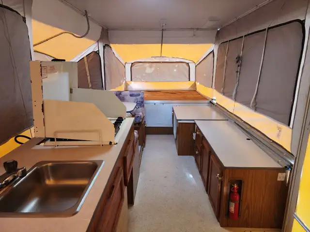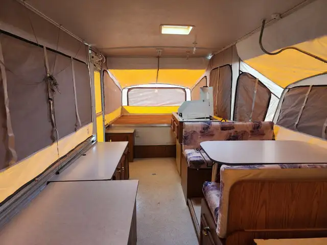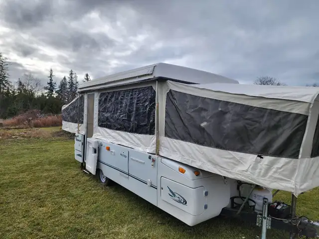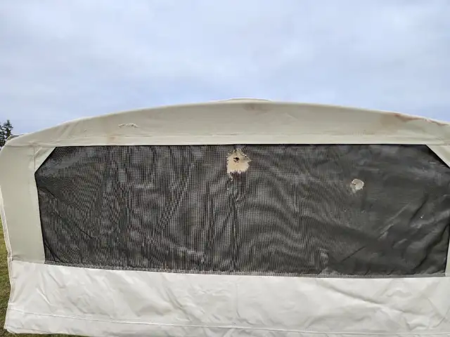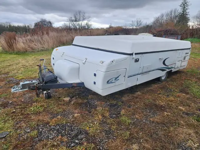 Jayco tent trailer. Long trailer for tent style, rare tip out. Surge brakes. Hot water heater land furnace. Canvas is one year old 2024, minor mice damage to canvas.
