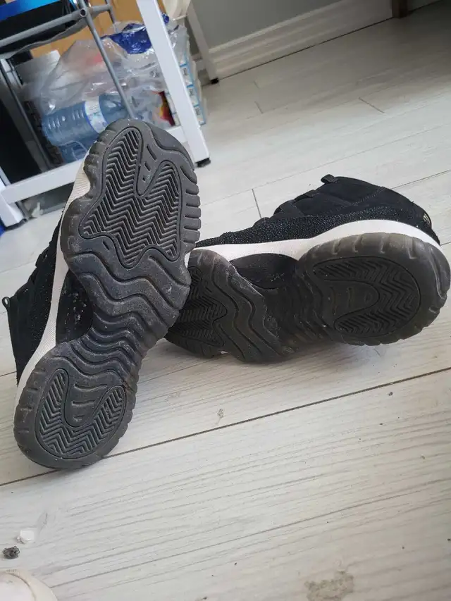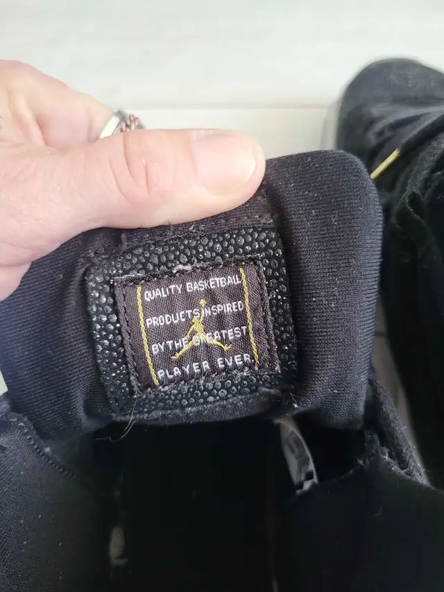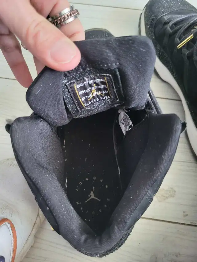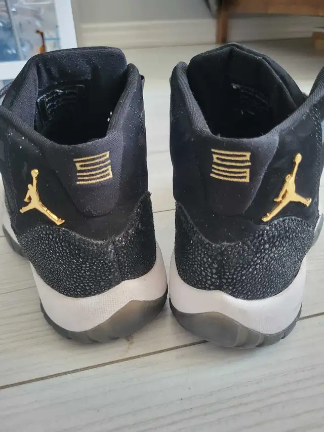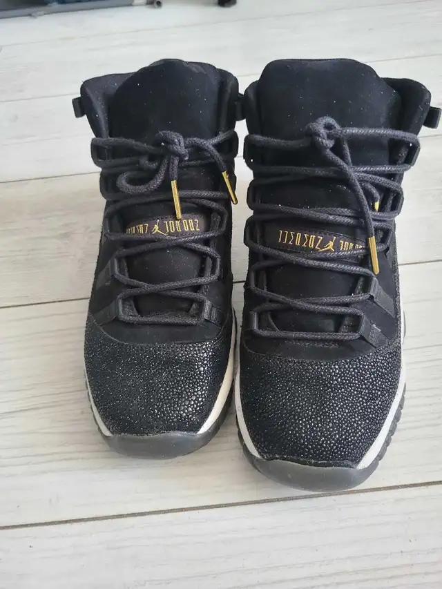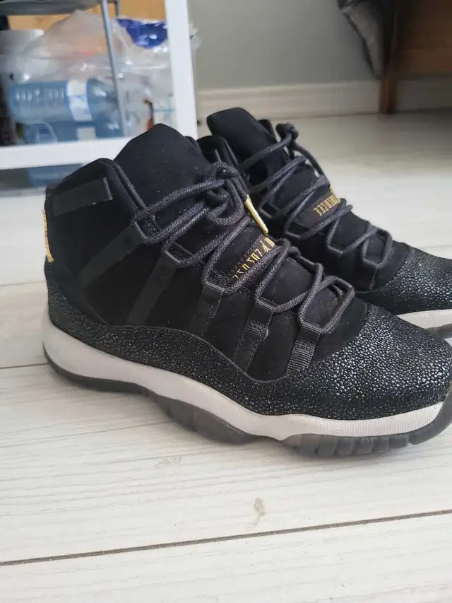 These are the Air Jordan 11 Retro Premium GS 'Heiress Black Stingray' sneakers. Released in November 2017 as a girls' exclusive, this "Heiress" edition replaces the traditional patent leather mudguard with a textured black stingray leather and features a premium black suede upper.