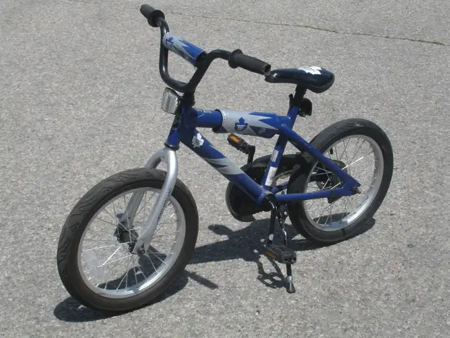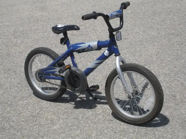 Selling today this little boy's 16" Toronto Maple Leaf bike that is outgrown for this year. The bike is a used one season & bike is in great condition overall. It comes fully equipped with 16" matching wheels, 1 speed drive with rear coaster brakes, 11" frame size, adjustable seat handle bar, kick stand and is blue/white in color. It would fit any boy ages 4 to 7 years old. Quick sale price only $45.00 FIRM & please don't bother emailing or calling if you want a better price FIRM FIRM FIRM. Call if your interested only @ ( 905)824-7783 & ask for Rich.