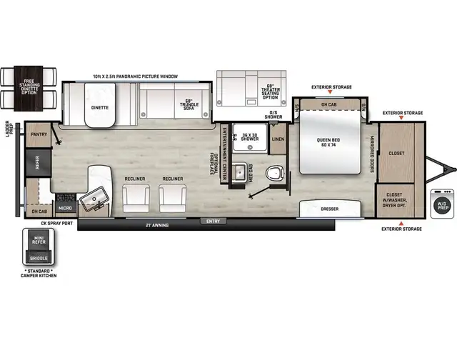 10 FT. SLIDEOUT WINDOW, PORCELAIN PEDESTAL TOILET, 12V 2 WAY MAXXAIR VENT FAN IN LIVING ROOM W/ WALL REMOTE, TRUNDLE SOFA IPO JACKKNIFE SOFA (PER FLOORPLAN), 360 SIPHON ROOF VENT, SKYLIGHT ABOVE TUB/SHOWER, BEDROOM USB & OUTLETS, 5/8in. TONGUE AND GROOVE FLOORING, ABS SHOWER/TUB SURROUND, LCI LADDER PREP.