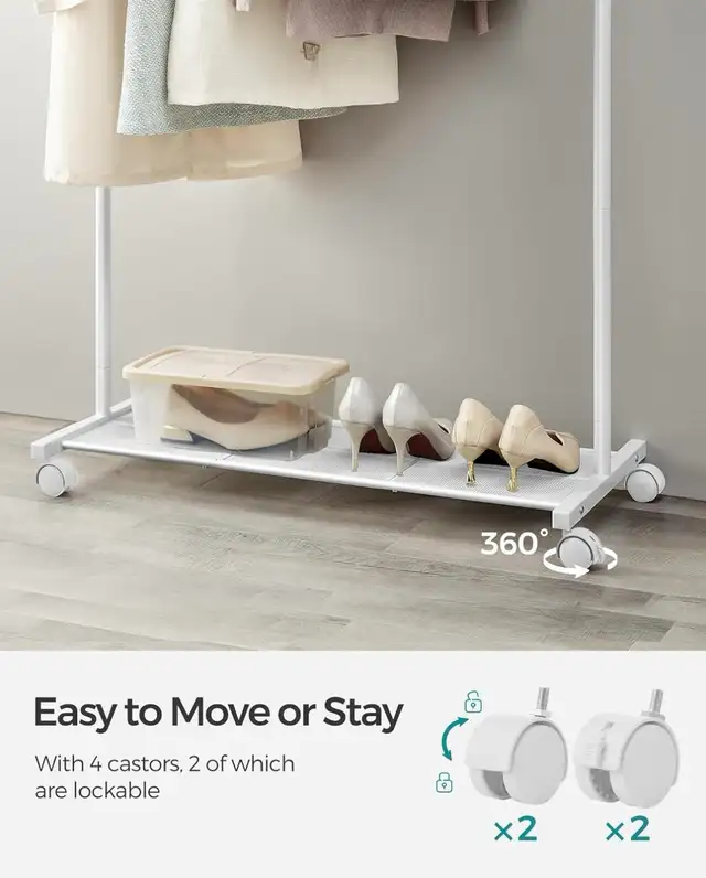 Add instant closet space with this sturdy rolling garment rack, perfect for organizing clothes in bedrooms, laundry rooms, or retail spaces. With a strong steel frame and bottom storage shelf, it keeps your clothing neat, accessible, and off the floor.