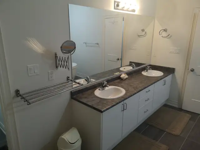 Master Bedroom Available for Rent, in NE Oakville Modern Home Spacious MasterBedroom for Rent, Tranquil View, Oakville Trafalgar/Dundas (NE quadrant) Modern Luxury! A Large, Spacious Master Bedroom for a Single in this Modern Oakville home near Trafalgar & Dundas. Available Mar 31, 2026. The Room has a Queen Bed, a Wall-mounted UHDTV, Dresser & Mirror, 2 bedstands/cabinets, Drawers, 2 wardrobe cabinets, Desk and 2 chairs. The room features a walk-in closet with lock. Master Ensuite Bathroom has a soaker tub, glass shower, 2 sinks, and a separate toilet room. The view from the bedroom is spectacular, and serene, facing green forest area (this is a home backing to ravine, no homes behind us). The room also features a high 10' ceiling. Common areas: Living room with big wall-TV, Large professional kitchen with gas stove-burners, 2 fridges, large island, and eating area. 2nd-floor laundry for convenience. For a Single: $1350 per month. Last month's rent & $50 key deposit. No smoking, no pets, no partying, no loud noise (especially during sleep-time). Respectful tenant only please. Currently one female and 3 male housemates. Walk out to the composite/wood deck, during 4 seasons, and catch some sun, read a book, watch a movie (still within wifi range) with your favorite beverage/snack. One parking space is included, on the driveway. Please contact Danny at 416-930-9020 cell/text, and tell me about yourself. Thank you!
