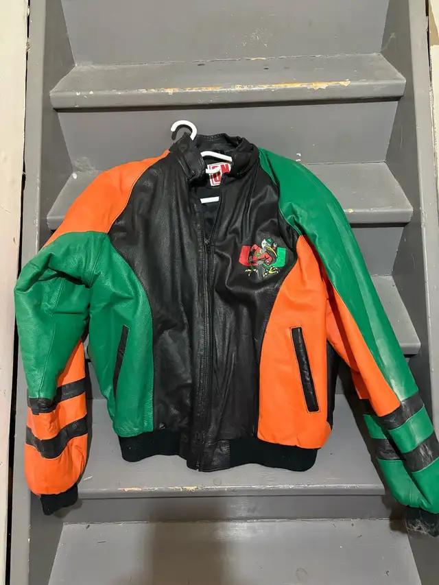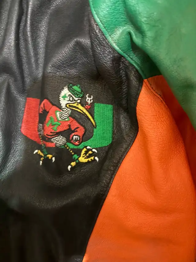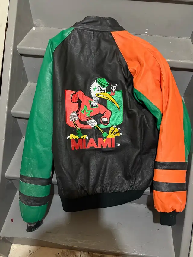 Miami Hurricanes leather jacket. Vintage , rare in great shape. Size is XL. Please text for faster response 647-285-8126. If ad is up it is available. Cash only $160 OBO.
