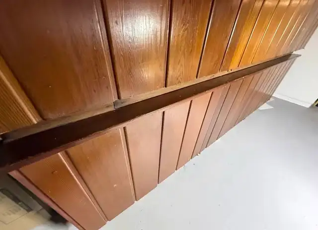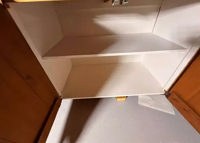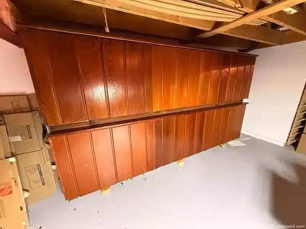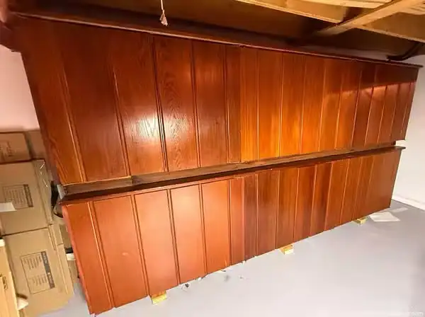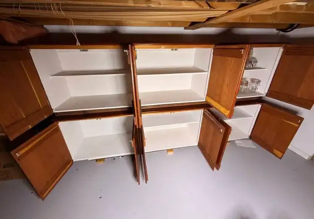 Base cabinets and storage cupboards - 2 sections with 8 cupboard doors with door push open system - some with shelves - 34.5" cupboard shelves - 9' Length X 20.5" Depth X 29" Height with 3" toe kick plate (each) - Natural wood,