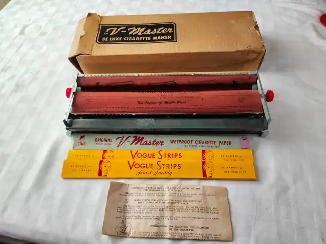 Antique V-Master cigerette roller. Excellent condition. Original box and cigerette papers included. $60.00. 780-243-1990