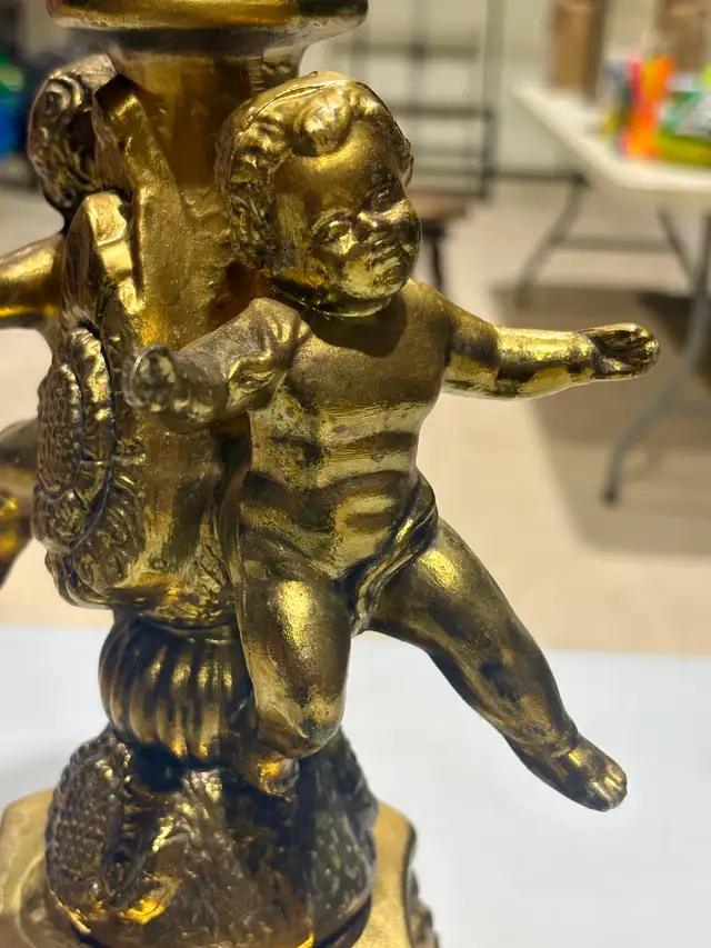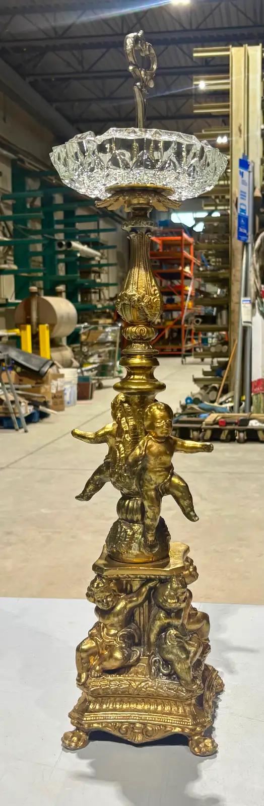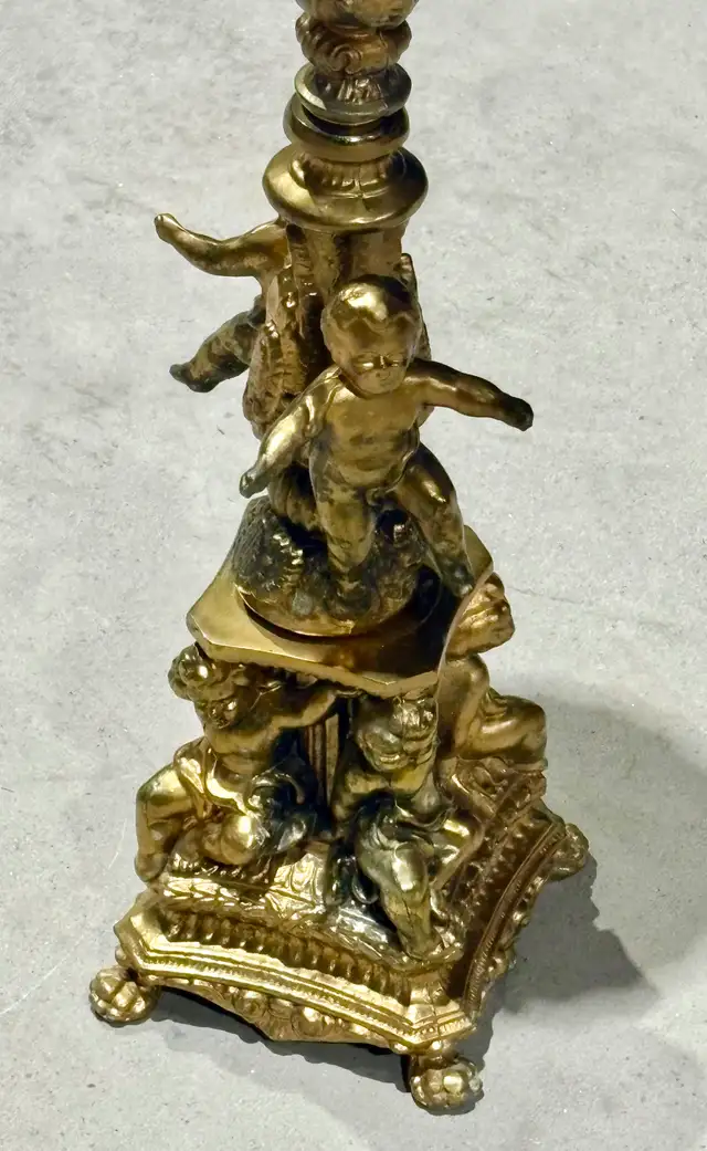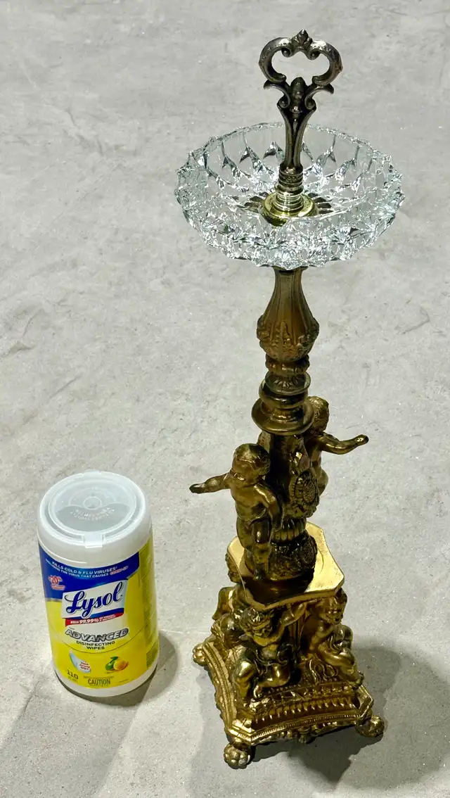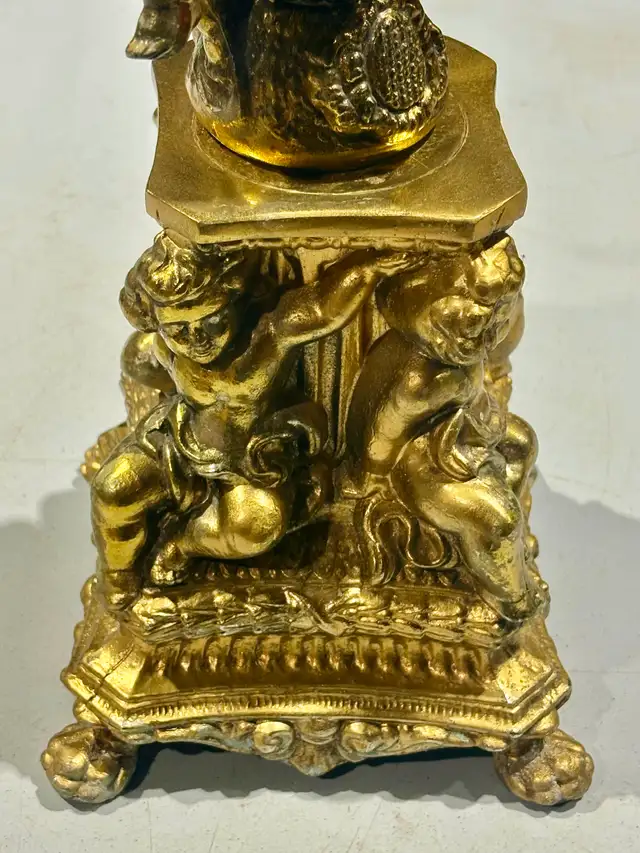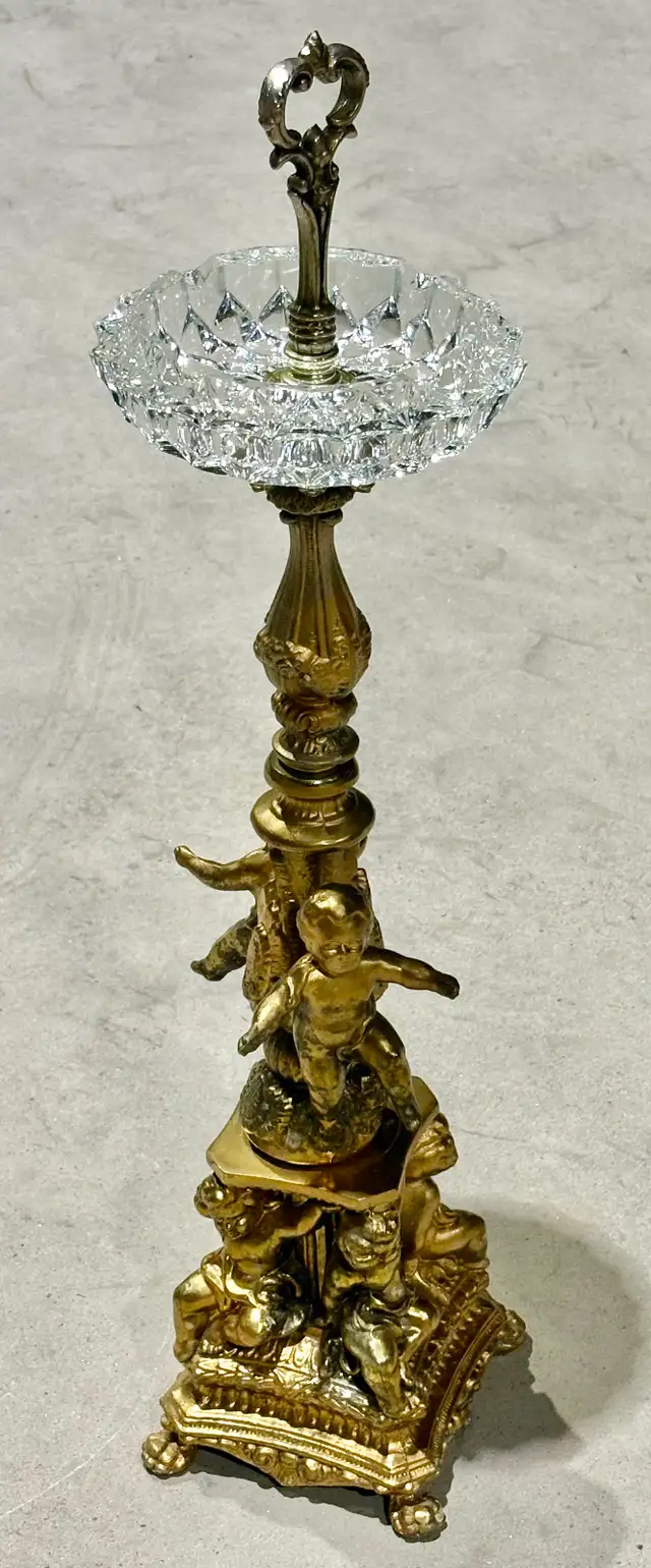 For sale is a vintage gilt-bronze and crystal centrepiece with cherub base. This ornate decorative piece exemplifies the Victorian and Rococo Revival styles popular in the late 19th and early 20th centuries. Such elaborate centerpieces combined gilt bronze figural elements with cut crystal bowls, serving both functional and decorative purposes in affluent homes. The cherub or putti motif reflects the period's fascination with classical mythology and romantic imagery, often used in decorative arts to convey luxury and refinement.
