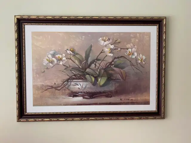 Framed print wall art of blooming white orchid arrangement in pot 28" x 40"