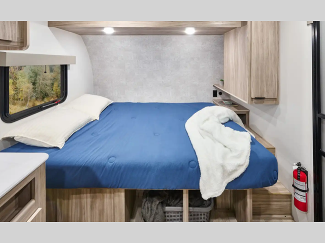This travel trailer is designed to make camping more comfortable, affordable, and fun for the whole family! The front 60in.in. x 80in.in. queen bed offers a comfortable place to lay your head at night and a shirt closet to hang your clothes. There are a set of 48in.in. x 68in.in. bunk beds for others to sleep, and you can even transform the 38in.in. x 68in.in. booth dinette into extra sleeping space. The fully equipped kitchen has everything you need to prepare a delicious home cooked meal and a 12V refrigerator to store any leftovers. After a fun-filled day, head to the rear corner bathroom to freshen up in the 30in.in. x 36in.in. shower with a skylight to let in some natural lighting!