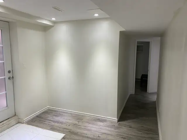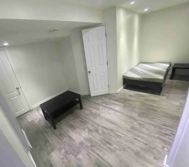 This room for rent is in a basement in Ajax. The room is spacious with extra room for a table and is furnished.