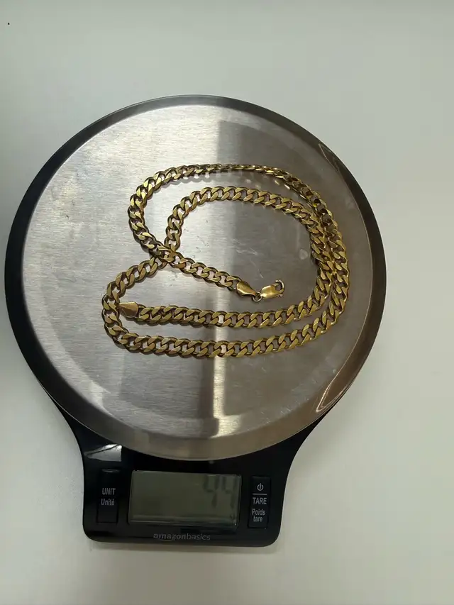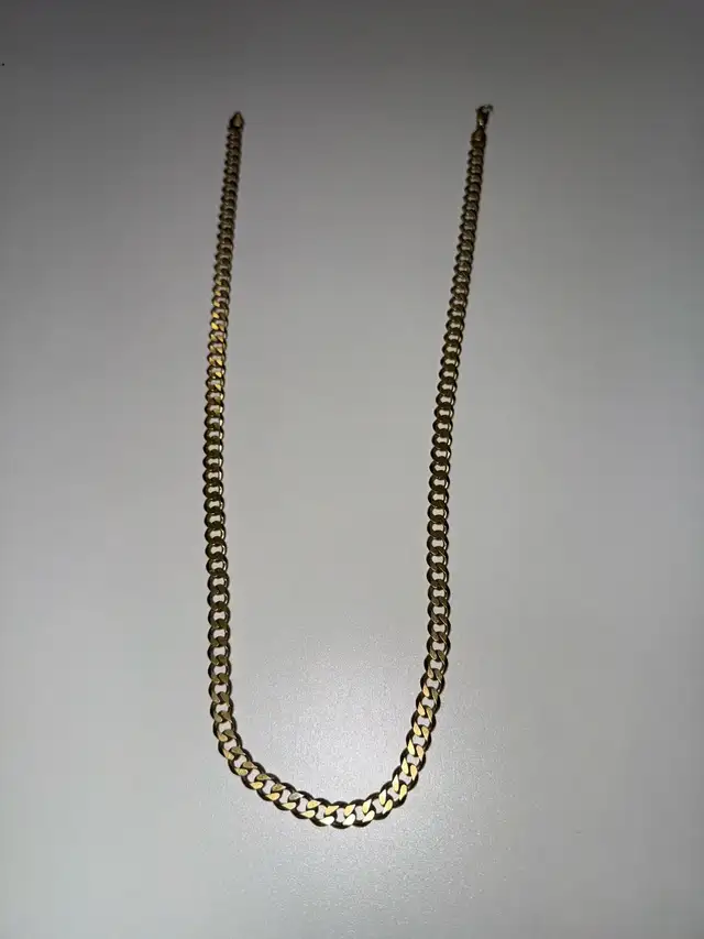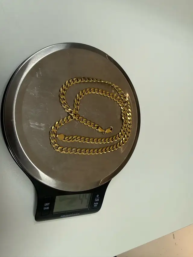 Beautiful gold plated Cuban link chain with a bold and eye-catching design. This chain has a solid feel and weighs approximately 44 grams, giving it a premium look without the high cost of solid gold.