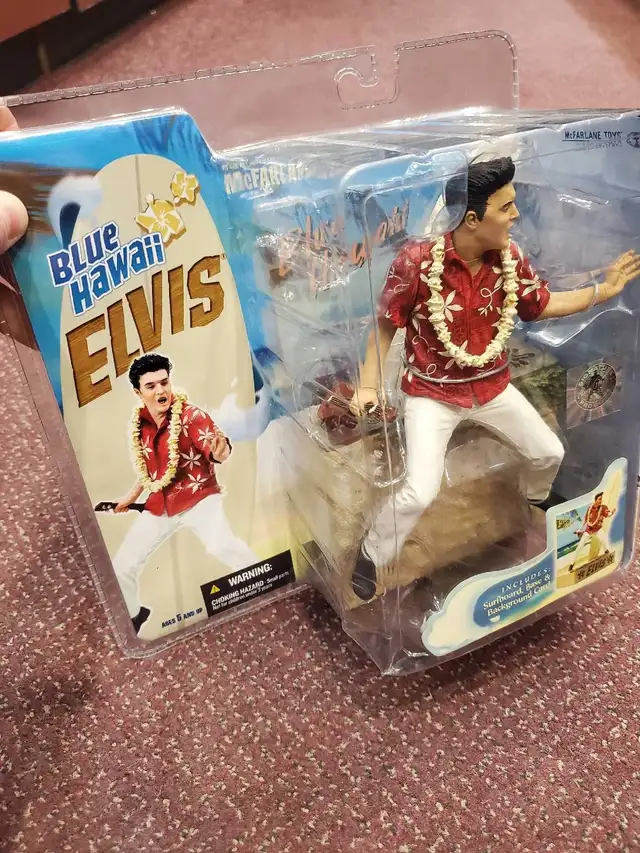 Awesome McFarlane Toys Elvis Presley action figure. This one is from the Blue Hawaii movie. Comes with a surfboard, base, and background card. Still in original sealed packaging, never opened.Buy & Sell Kings Ajax.