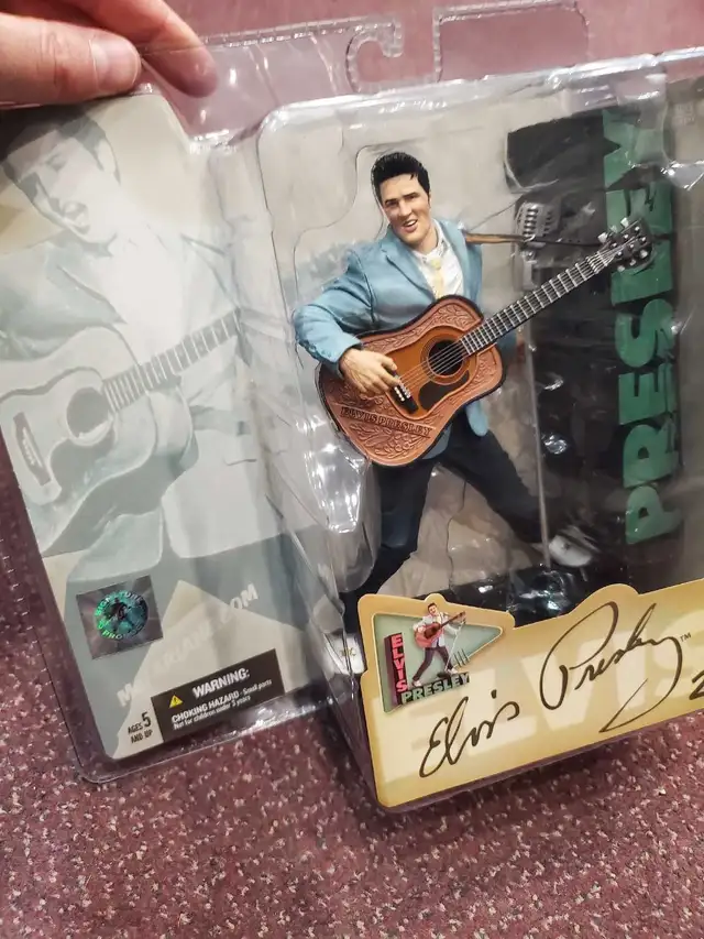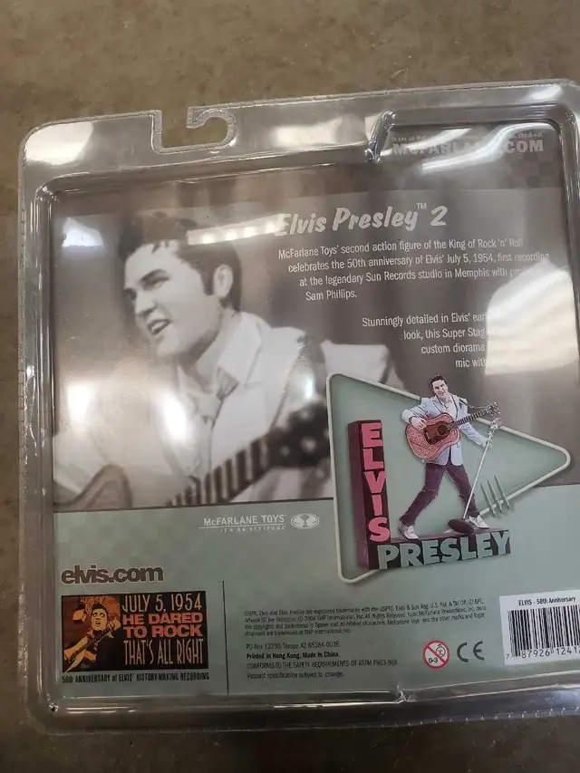 Awesome McFarlane Toys Elvis Presley action figure. This is the Series 2 figure celebrating the 50th anniversary of his first recording. It has Elvis with his guitar, a microphone stand, and a custom diorama base. Still sealed in the original packaging.Buy & Sell Kings Ajax.