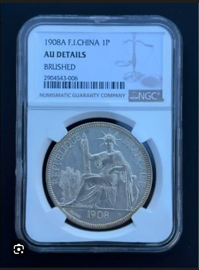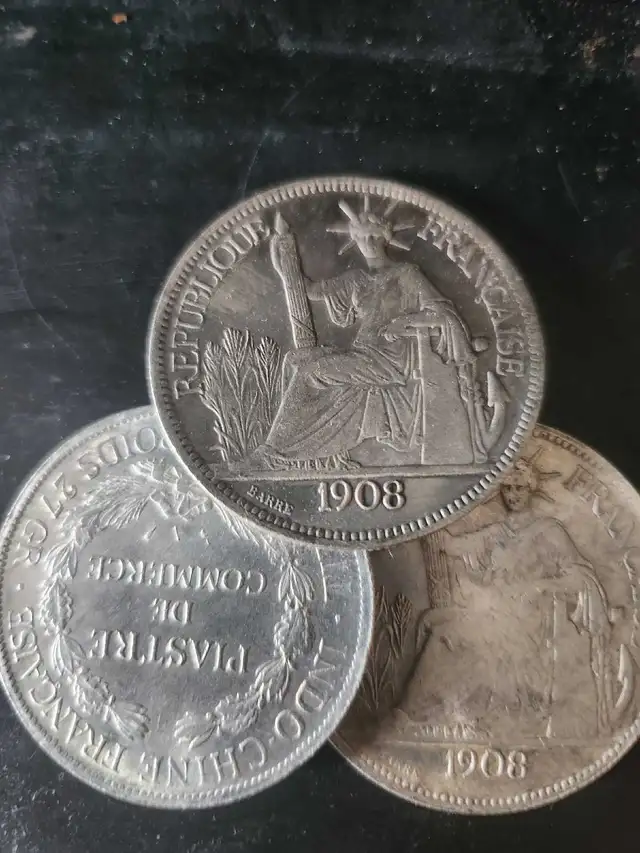 This is a 1908 Piastre coin from French Indo China. It's made of silver and has a weight of 0.900. This coin is a piece of commerce.