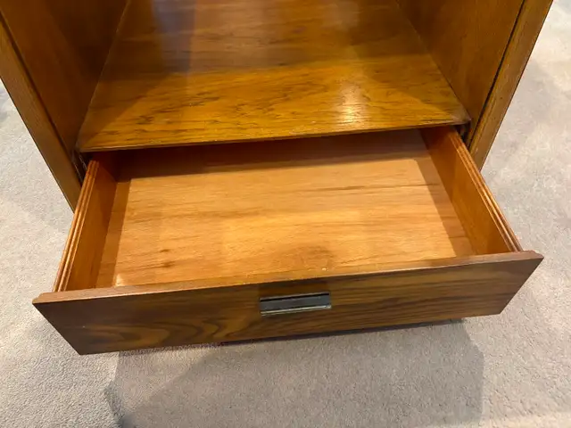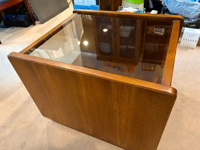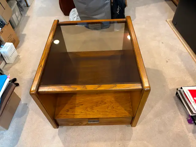 Solid Canadian oak construction with oak veneers with glass insert coffee table with convenient lower storage drawer. Overall oak table size is 28"L X 24"W X 22" High; and, thick tempered top display glass insert is 24"L X 21"W . Nice condition overall but with (repairable) glass chip as shown on one corner from recent move. The magazine and book storage drawer on bottom is 15" X 20" X 4" depth. Top quality Canadian solid oak furniture piece but do not have room for it. Selling for $20 complete. Phone my land line at 403-275-8151 to arrange purchase. Ad will be removed after this item has been sold, thank you.