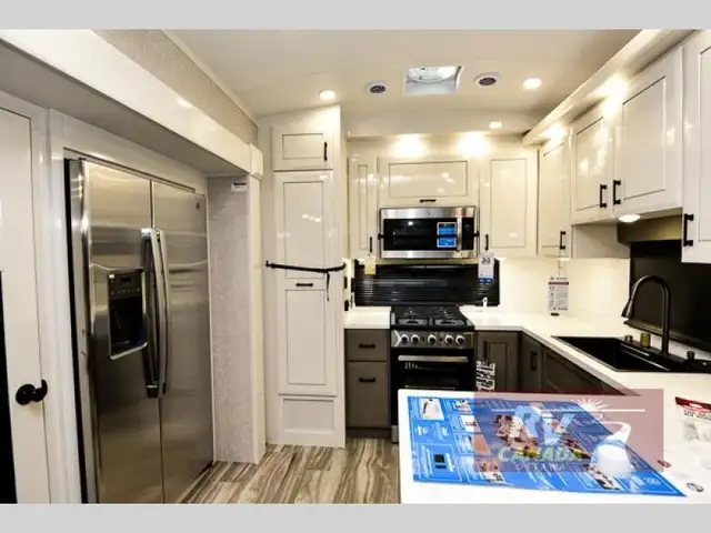 Each Pinnacle fifth wheel features Stronghold VBL lamination for the lightest, yet strongest construction in the RV industry. Add that to the Magnum Truss XL6 roof system and Climate Shield zero-degree tested weather protection and you'll be enjoying your fifth wheel for years to come. Some of the exterior conveniences you will appreciate are the Keyed-Alike lock system, the fully enclosed, universal docking center, and the 6-point hydraulic auto-leveling system for quick and easy set up. The 5 Star Handling Package will make towing a fifth wheel a walk in the park, and the two Whisper Quiet A/C units will keep you comfortable during the hot summer months. Inside, you'll enjoy the residential in.in.Do it allin.in. sink with pull-out kitchen faucet, glass rinse, and vegetable rinse, the handcrafted hardwood glazed cabinetry, the vinyl flooring throughout, plus many more comforts. There is even a central vacuum system, a wireless remote control system, USB ports throughout, plus many more conveniences to make each trip enjoyable.