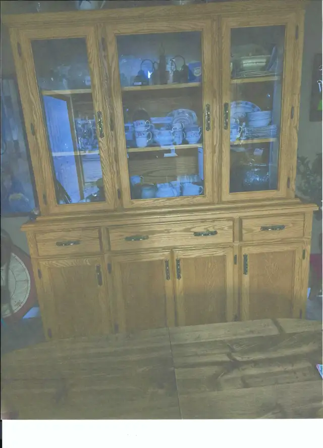 Solid oak China cabinet asking only $500.00 or best offer. Top section has glass doors, great for displaying your favorite dishes. Bottom part has three drawers and three cabinet doors. Hardware is decorative. Dimensions are: Width 20 inches, Length 68 inches, Bottom part height 36 inches, Top part height 42 inches, Top part width 60.5 inches.......From the intersection of Hwy 16 across from Flaman Equipment a turn west onto Auction Mart Road (71st Street) drive west 4 km to the STOP sign at intersection (71st Street and Range Road 3062, turn right and drive north 1.4 km to the second Driveway with a Canadian Flag over a sign EandEacres 3'x6'. The driveway has a blue RM sign showing "475" 639-525-3077 We are back Home by 2:00PM this afternoon