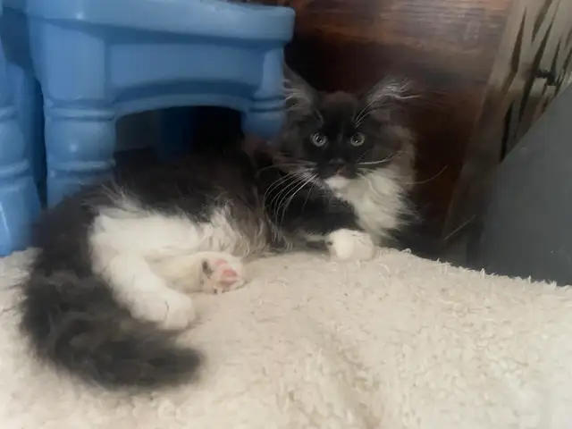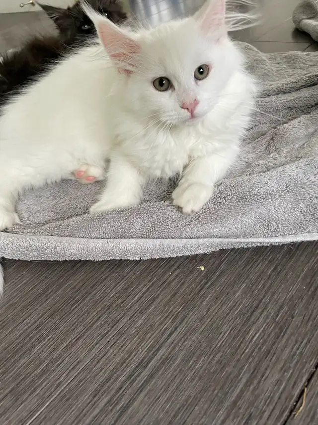 3 beaux chatons maincoon pure race(femelles )de parents enregistrés tica. Ils sont sociables avec les enfants et autres chats et chiens. Seront prêt pour 18 mars avec vaccins et bilan de santé. 2blancs(1 polydactile (vendue)) et un black tuxedo.