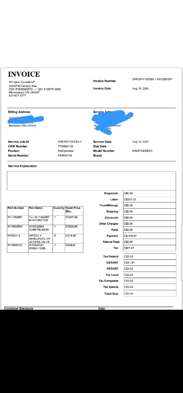 This Kitchen Aid Refrigerator was bought in march 2018 when we moved into our newly built home in Mayfield Village.Worked well and suddenly stop cooling in 2024 August. We called kitchen Aid to get it fixed .They changed the Compressor and installed a Brand New one .( Compressor covered by Kitchen Aid ( However we had to pay out of pocket expenses to the technician. 500$ ) .We thought it was fixed but no still not cooling.