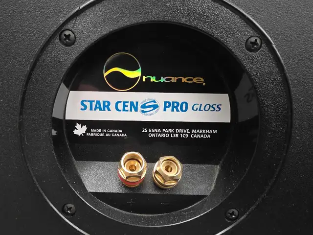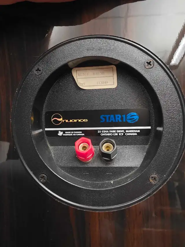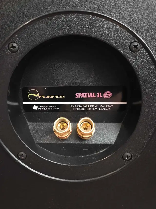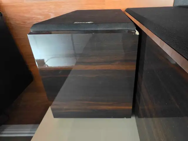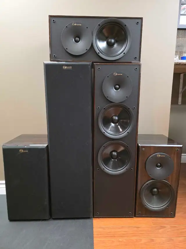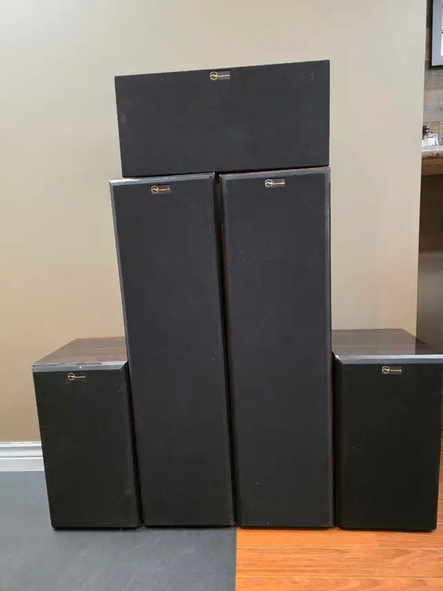 Nuance surround sound Speakers. Cherry wood exterior. These have been barely used. Unfortunately there are a few scratches and 1 chip on one of the Speakers. These are moster Speakers and are very loud.