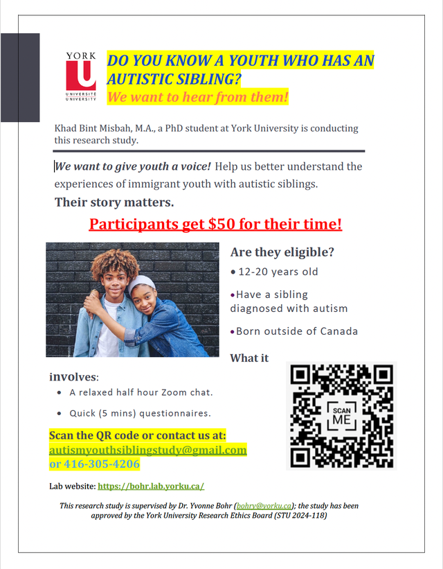 Participation is voluntary, confidential, and flexible. If you think you or someone you know might be eligible or you're curious to learn more, feel free to reach out at autismyouthsiblingstudy@gmail.com or scan the QR code in the flyer.