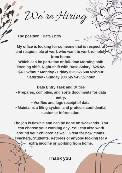 We're currently looking for detail-oriented individuals to join our team remotely. This role involves entering customer and patient data into our system. It's a flexible position paying $30/hour, with both part-time and full-time opportunities available. You can set your own schedule, making it a great fit for stay-at-home parents, retirees, or individuals with disabilities. Benefits are included. Message me directly if you'd like to apply: officemail71352@gmail.com