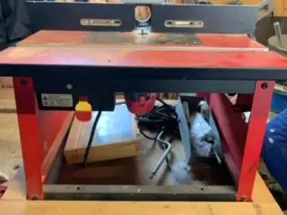Freud Router with Bit Set and Cutting Table – up off the ground on raised platform. 2 1/4 Horsepower. Complete Ryobi bit set. One broken bit. Comes with case for router. Call/Text me 780-994-1087 Ed