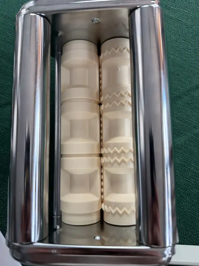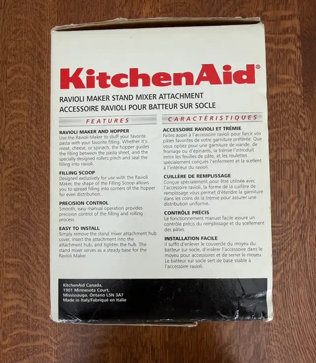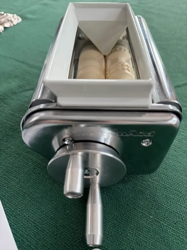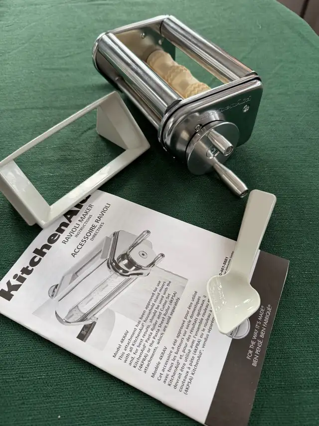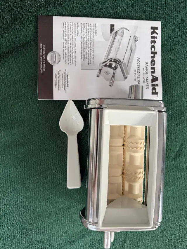 I'm selling a KitchenAid Ravioli Maker Attachment, model 4KRAV, designed to easily create delicious homemade ravioli. This attachment connects to your KitchenAid stand mixer to form large ravioli pockets with an easy-fill hopper. The set includes the stainless steel ravioli attachment, filling spoon and the instructio/recipe manual in it's original box. This attachment complements the pasta roller set that I am also selling - please see my other ads.