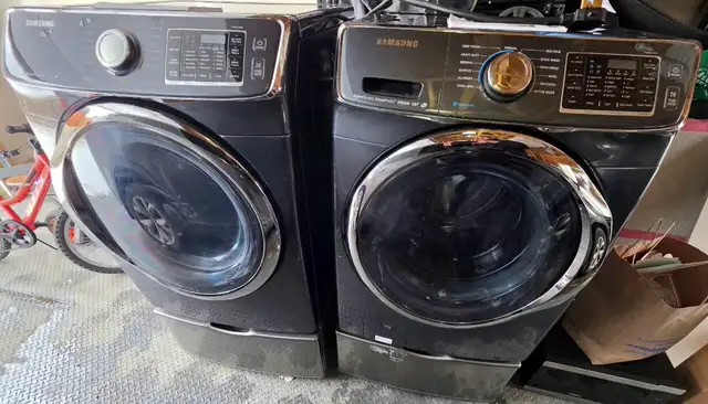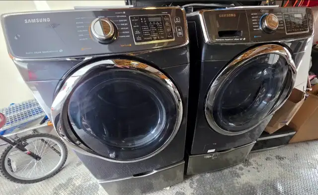 Samsung Washer and dryer with steam cycle options and large capacity with manuals too, the washer is in good condition and ready to use but the dryer needs a new replaceable band or repair, the dryer heats and works but doesnt spin or turn, they also have pedestal stands with droors under them, we purchased a new set so were letting these go for $100 call, text or email anytime there in our garage ready to go
