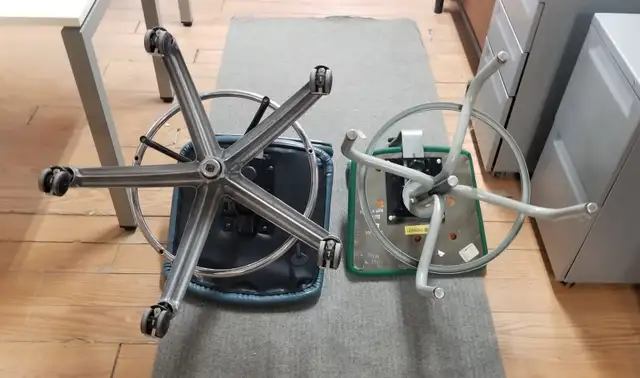 ** Please note that the c1980s green and gray industrial drafting chair in the photos, is there for size and design comparison, and shows an earlier design with only 4 legs, a narrower leg diameter, no wheels and a ring foot-rest which is not adjustable in height.