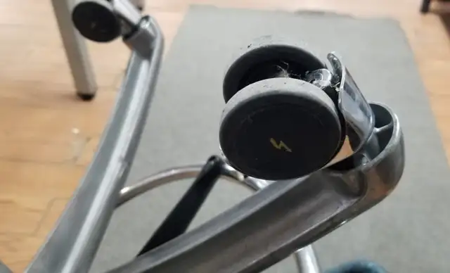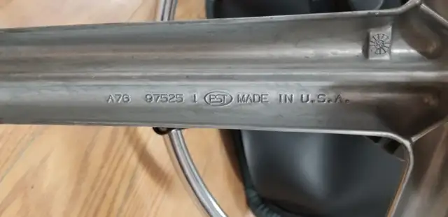Cast aluminum 5 spider legs with plastic wheels, and cast print underneath: A76 97525 1 EST Made in USA.