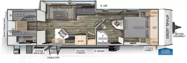 The Cherokee Grey Wolf 29TE by Forest River is a spacious travel trailer designed for families. With a double entry and outdoor bathroom access, this RV offers convenience, flexibility and affordability. The rear bunkhouse provides ample sleeping space for kids, while the outdoor kitchen, complete with a side-by-side refrigerator/freezer, ice maker, cooktop, sink, and storage, is perfect for outdoor entertaining. Experience the ultimate in family camping with the Cherokee Grey Wolf 29TE!