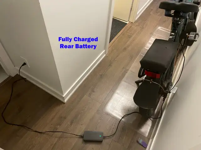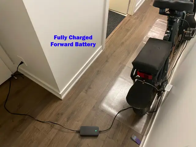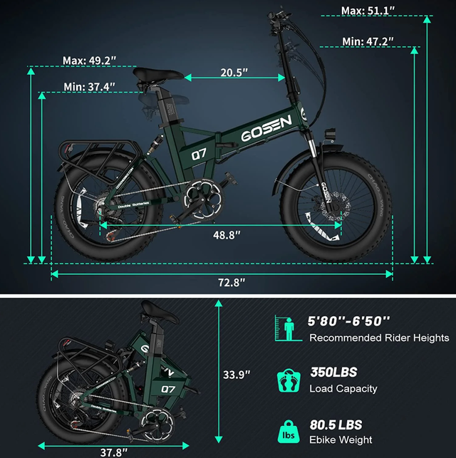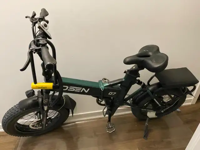 Gosen Q7 20" Fat Tire folding e-bike, comes with its default charger and keys. It features a powerful 750W (peaks at 1000W) motor and a massive dual-battery setup (48V 31Ah total) for long range; for reference, I've ridden it from downtown Toronto all the way to Oakville. Its top speed is 45 km/h (28 mph). The e-bike is ~4 years old and it rides smoothly, the motor pulls strong, and the batteries hold a solid charge.