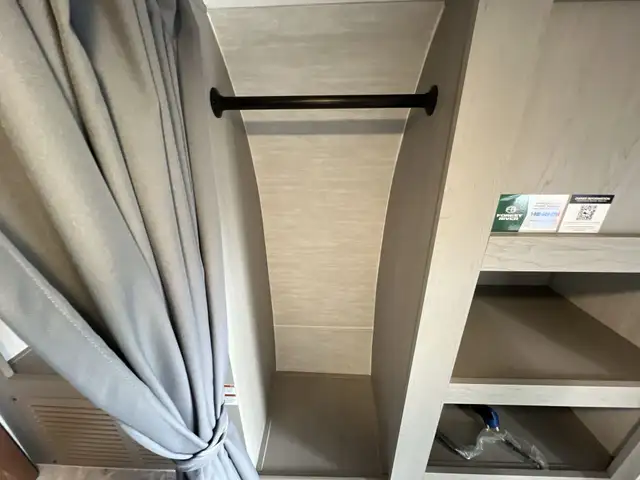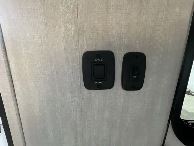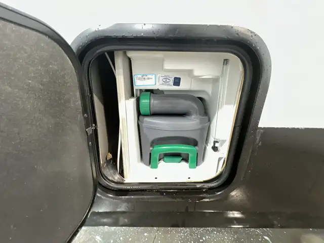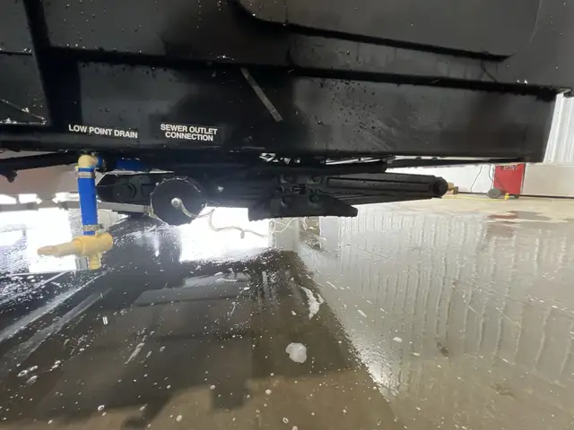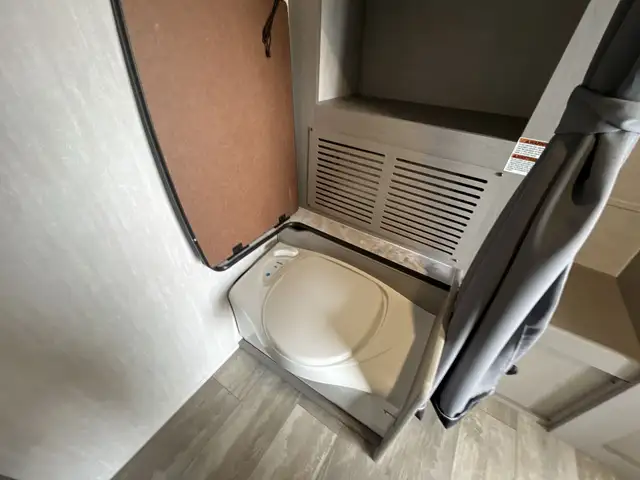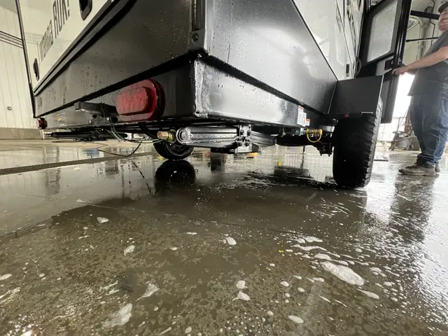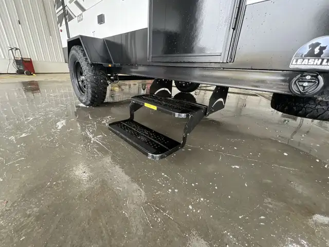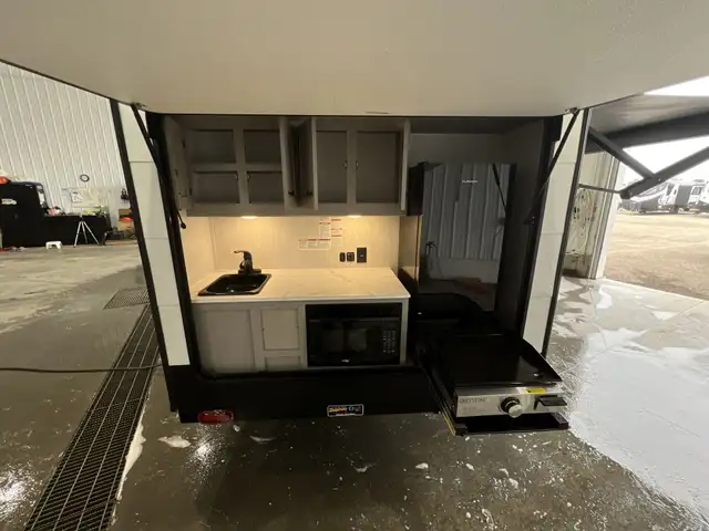 On the exterior you get an elegant look on this amazing camper, Large awning and rear outdoor kitchen, outdoor shower, rugged suspension and solar are among a few upgrades on the outside. On the inside you get a wide open concept with dinette that converts into a king sized bed, a cassette toilet.