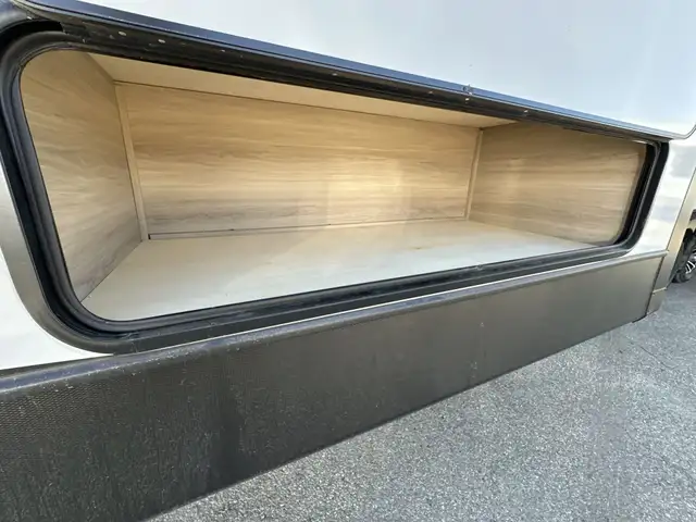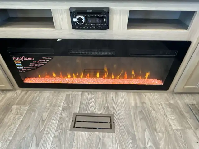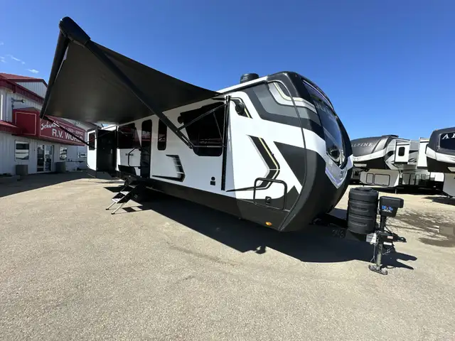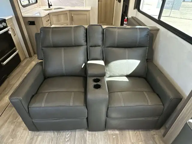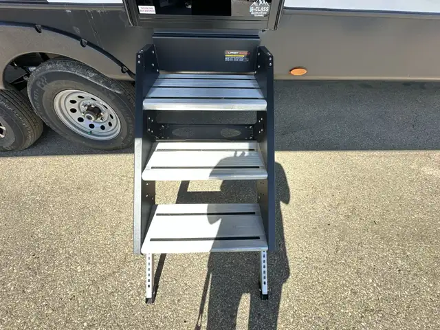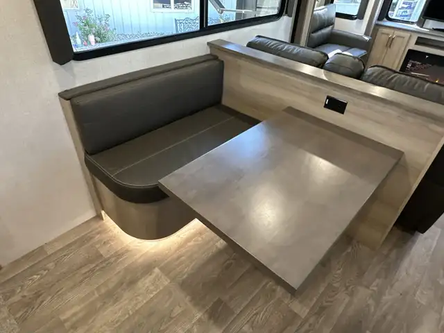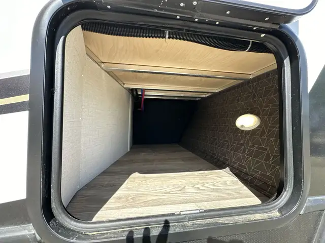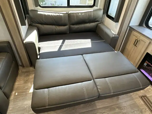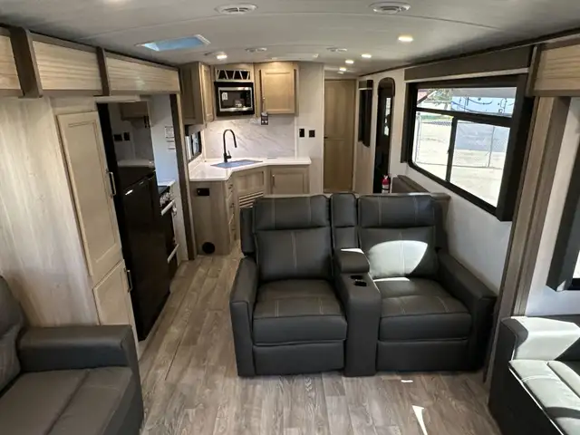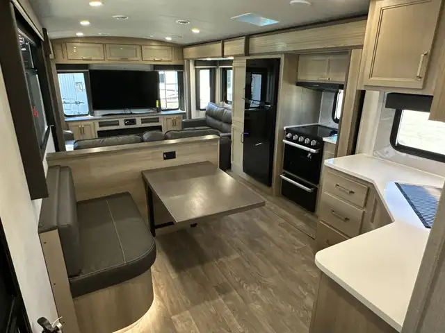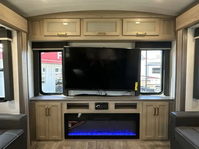 On the exterior you get an elegant look on this amazing camper 220 watts of solar, a large awning and storage are among a few upgrades on the outside. On the inside you get a 12 volt fridge, an island, tons of counter space, and wide open concept with table & chairs with bench dinette and pantry, double recliners across from your entertainment center as well as 2 tri-fold couches across from each other and a fireplace. In the bathroom there's a toilet, sink with vanity and shower. The master bed is a king sized bed, washer/dryer prep with lots of storage.