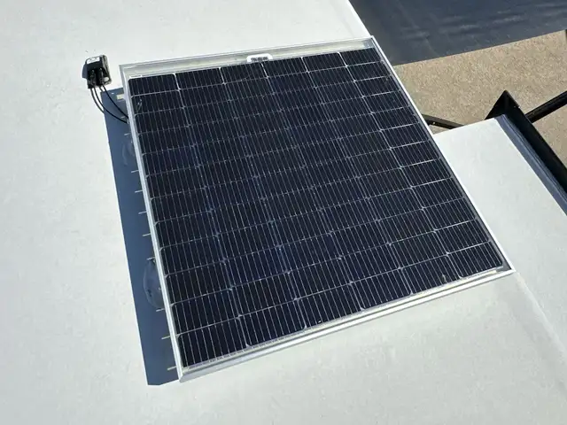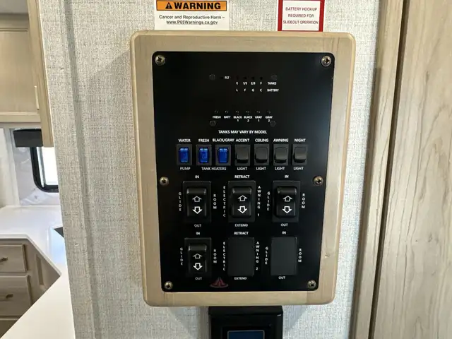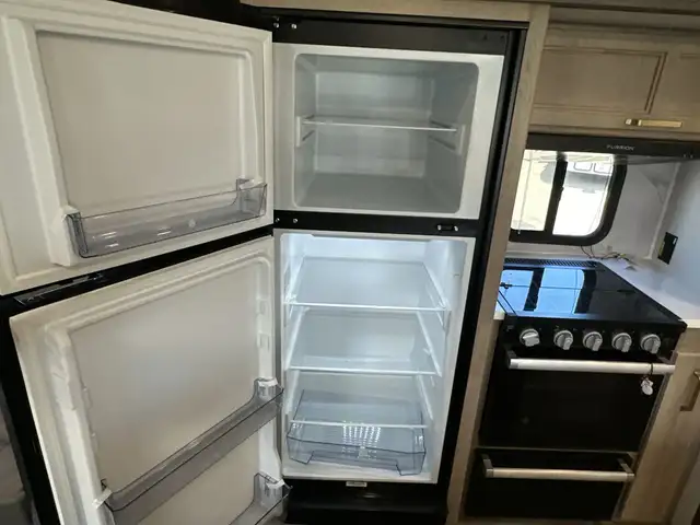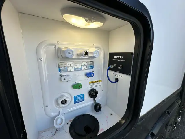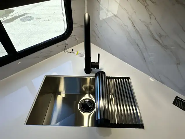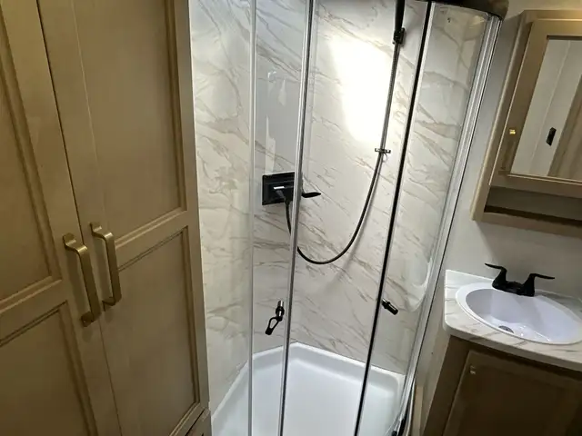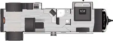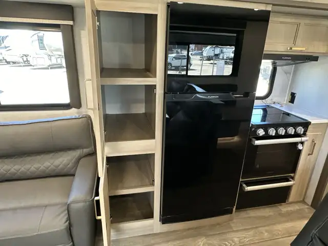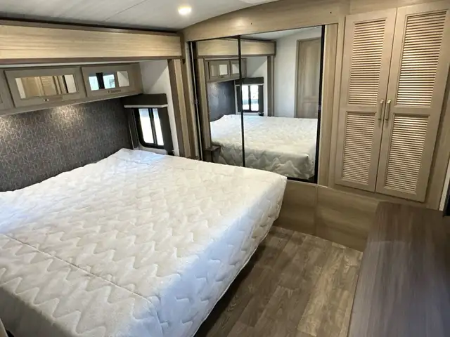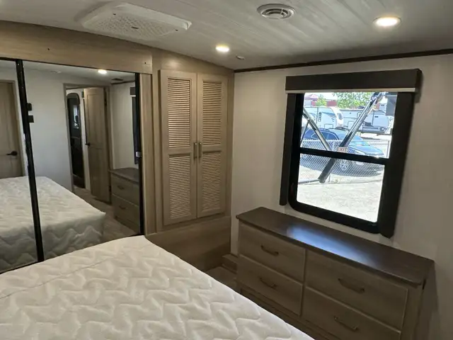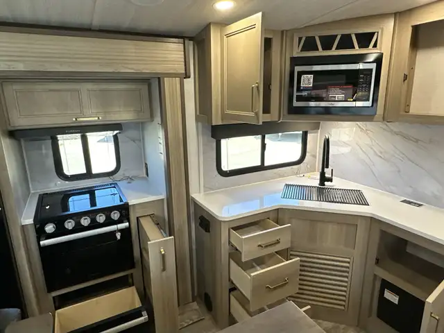 On the exterior you get an elegant look on this amazing camper 220 watts of solar, a large awning and storage are among a few upgrades on the outside. On the inside you get a 12 volt fridge, an island, tons of counter space, and wide open concept with table & chairs with bench dinette and pantry, double recliners across from your entertainment center as well as 2 tri-fold couches across from each other and a fireplace. In the bathroom there's a toilet, sink with vanity and shower. The master bed is a king sized bed, washer/dryer prep with lots of storage.