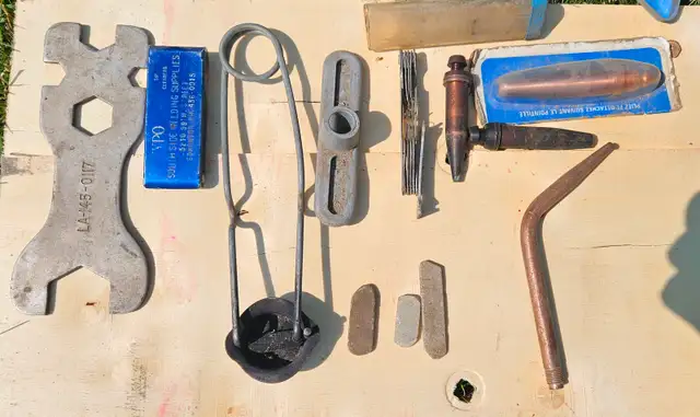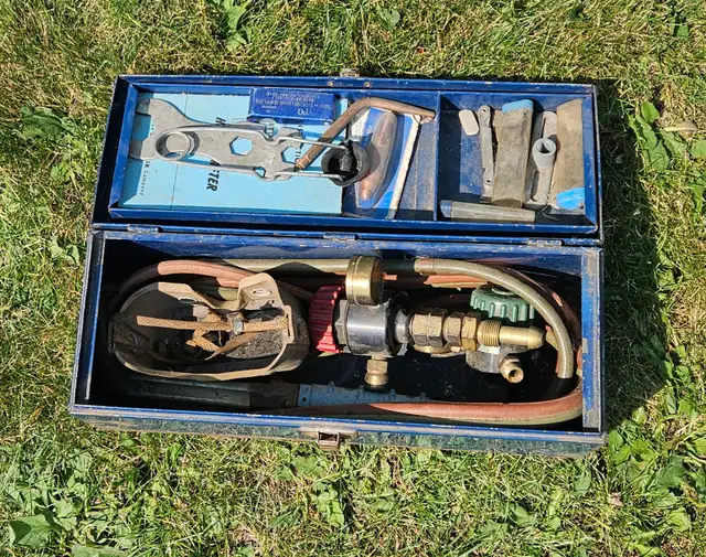 Kit includes a mix of tools including but not limited to acetylene and oxygen pressure gauge bottle valves, cutting and brazing tips, tools, manuals, hose, spark striker, safety glasses and torch.