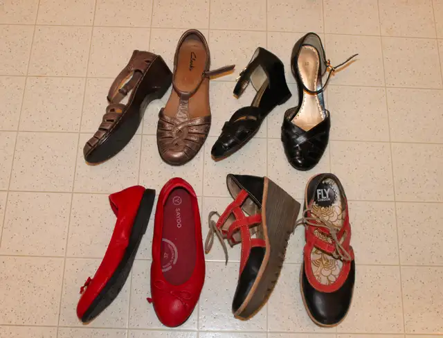 All leather shoes: Sandals by Clarks & Naturalizer. Ballet flats by Saydo. Funky by Fly. $100 for all 4 pairs. Mount Pleasant, NW Calgary. Cash/small bills. Landline/no texting (403) 454-0878.