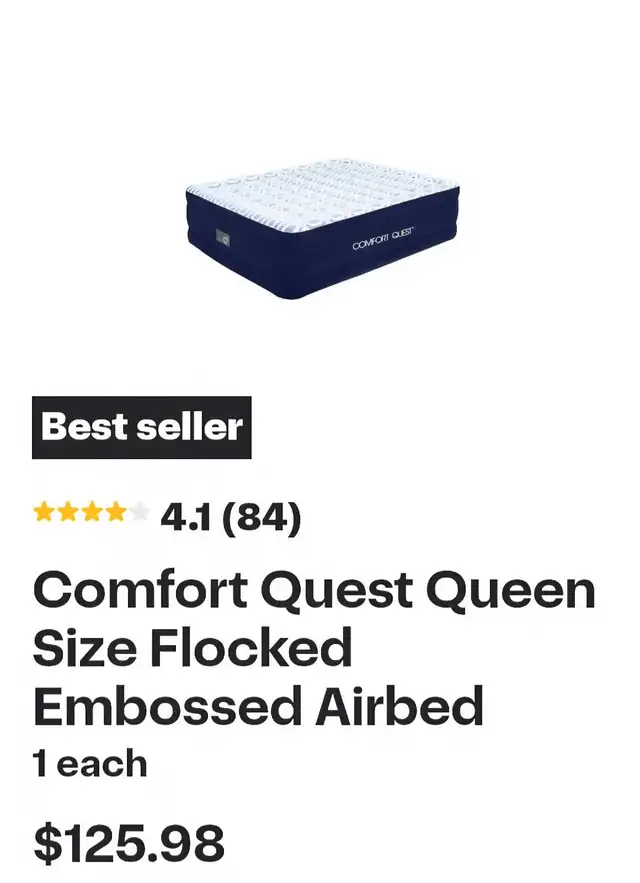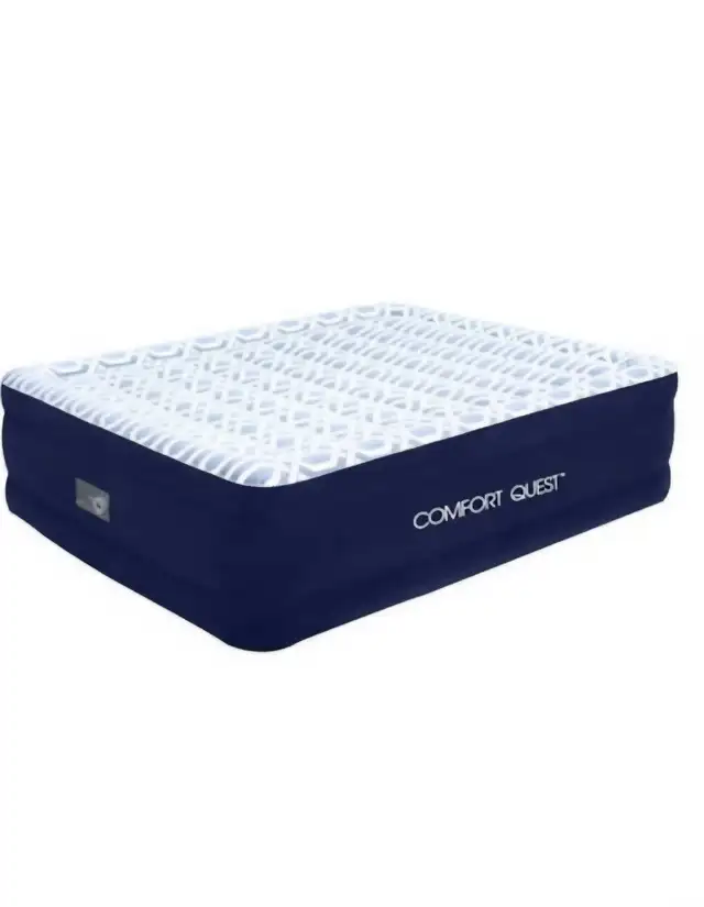 Queen size, double high, Air Bed. Purchased from Walmart on instacart. Extremely comfortable. Used gently for 10 days for just one adult, (average size) without any problems. Selling because I don't need it anymore. Well taken care of. Bed, pump and electrical cord all in excellent condition.