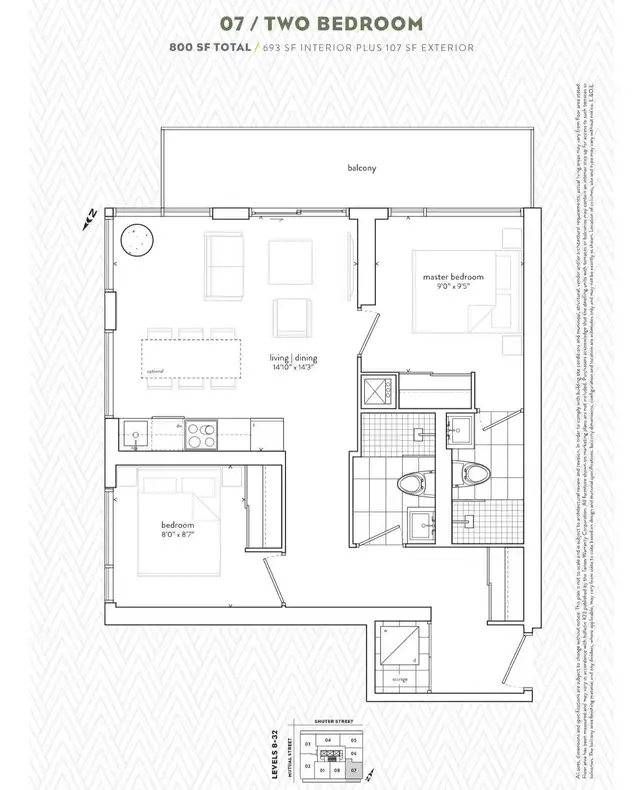 Size: Interior is 693 SF, Exterior is 107 SF, Total is 800 SF