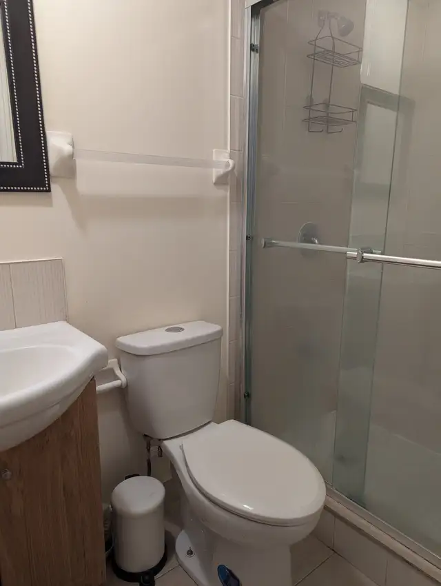 ** The room has a private, ensuite 3-piece bathroom with toilet, sink and glass shower stall.